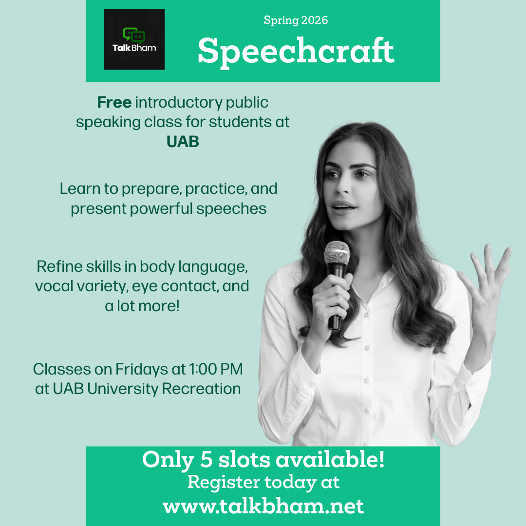 This is a FREE class for UAB students. There are only 5 slots available for participation, but you can still come to watch the speeches even if you miss out on those slots. Register here.
